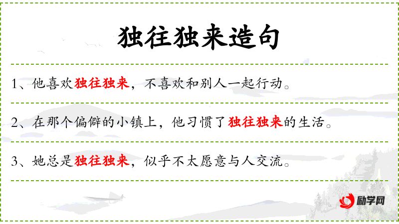 2. 【独往独来】 - 指行动自由,没有阻碍。又指作文用字独具一格,后指单独往来。