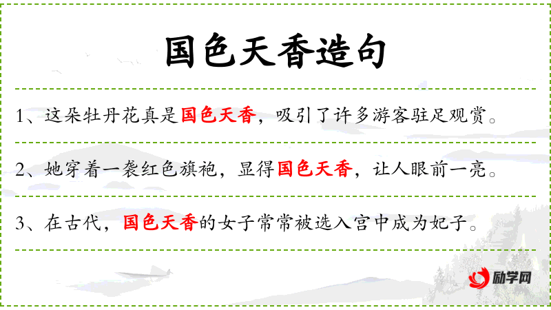 - 国色天香:形容女子美貌非凡,也用来形容花卉的美丽,特别是牡丹。