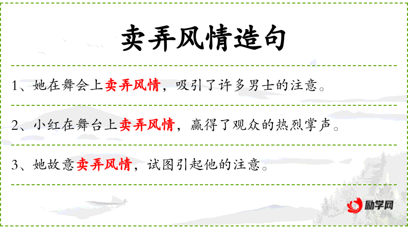 - 卖弄风情:故意展示自己的魅力或吸引力。