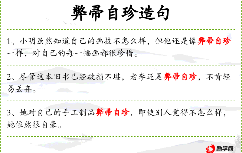 - 谓语:弊帚自珍、花时间精心打理