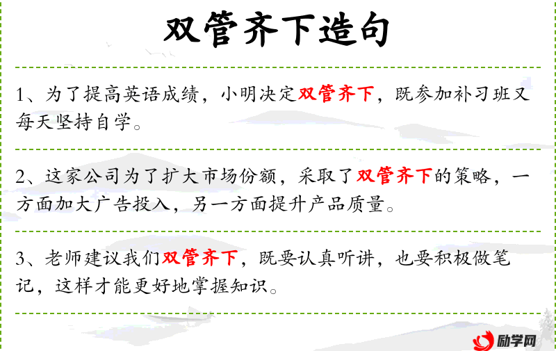 - 直接宾语:双管齐下,既要认真听讲,也要积极做笔记