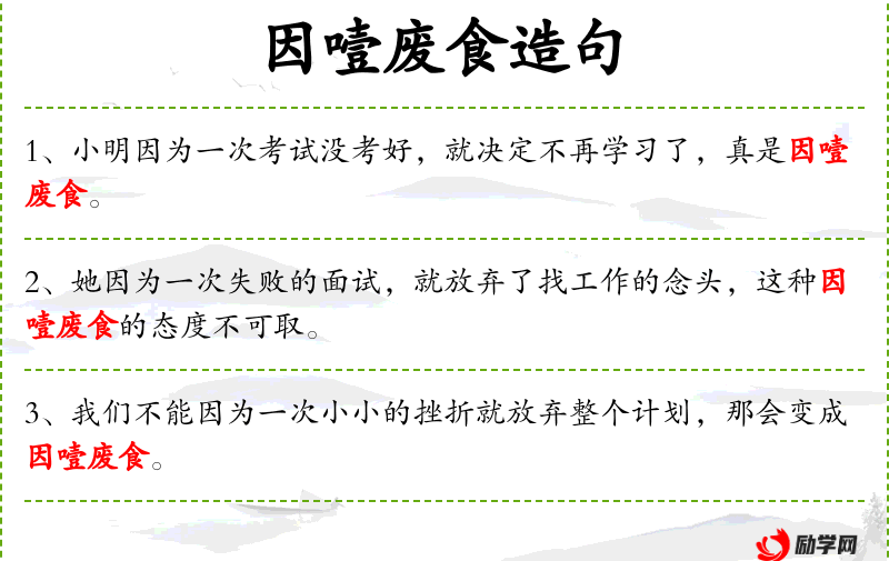 因噎废食是一个成语,源自《左传·宣公十五年》:“因噎废食,非所以养人也。”比喻因为害怕失败而不敢再尝试。这个成语在文化中常用来警示人们不要因为一时的困难或失败就放弃长远的目标。
