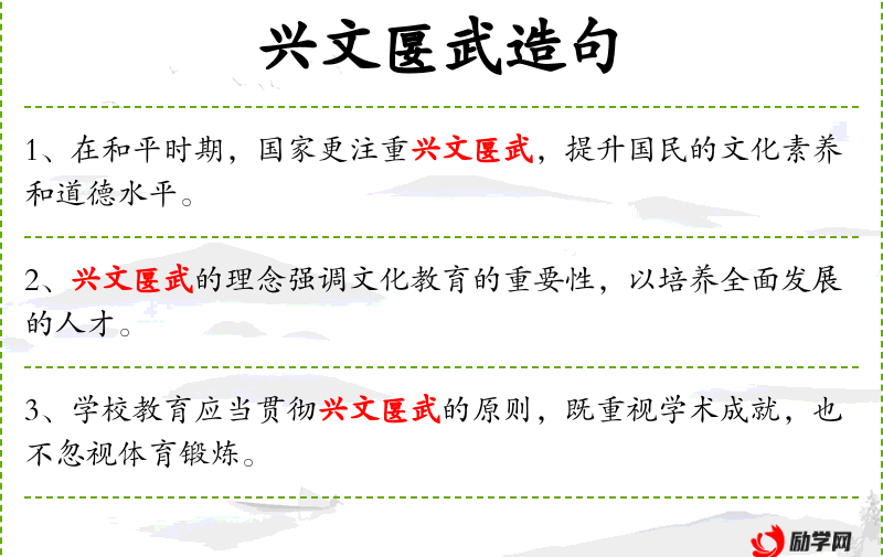 - 宾语:兴文匽武,提升国民的文化素养和道德水平