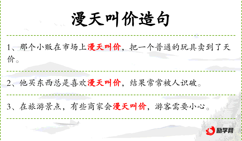 3. 【漫天叫价】 - 犹漫天要价。形容所提出的条件、要求过高。