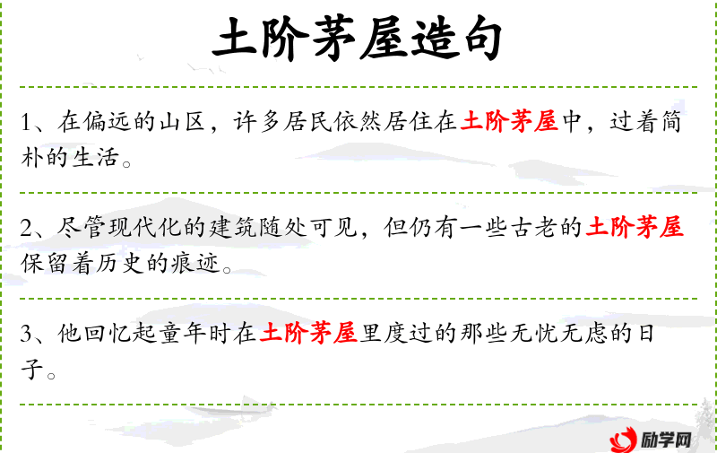 - 土阶茅屋:指用土和茅草搭建的简陋房屋,常用来形容贫困或原始的生活环境。