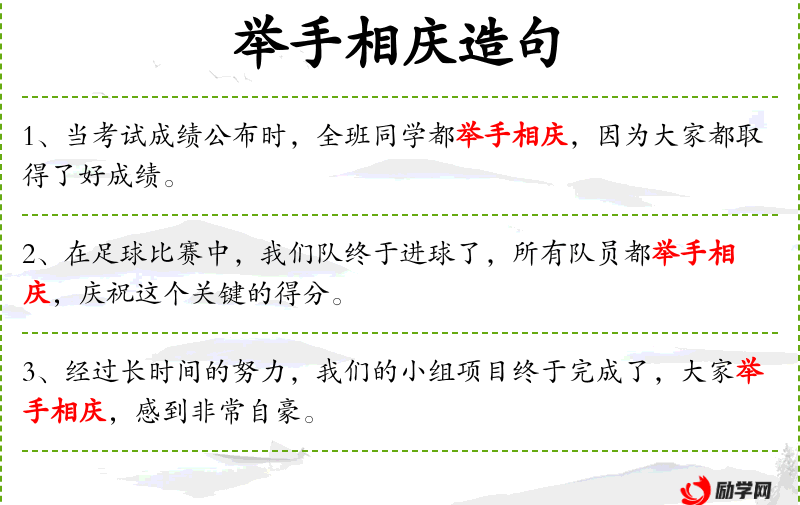 - 补语:兴奋地举手相庆,分享这份喜悦