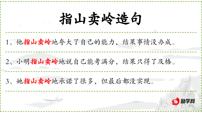 - 成语:指山卖岭,源自**古代,形容人夸大其词,不切实际。