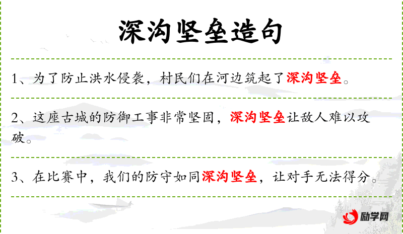 3. 【深沟坚垒】 - 深的战壕和坚固的营垒。指坚固的防御工事。