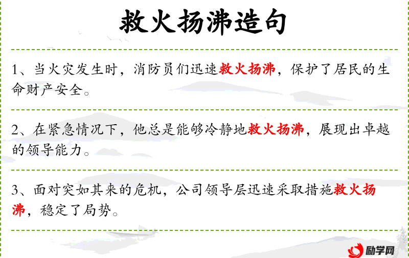 - 救火扬沸:put out fires and calm the waters,比喻在混乱或危机中采取措施恢复秩序。