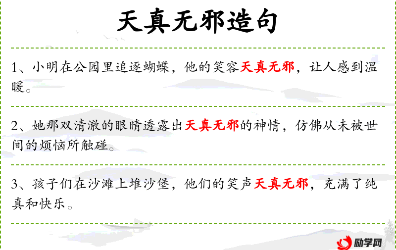 - 天真无邪:形容词短语,形容纯真、不带邪恶的特质。