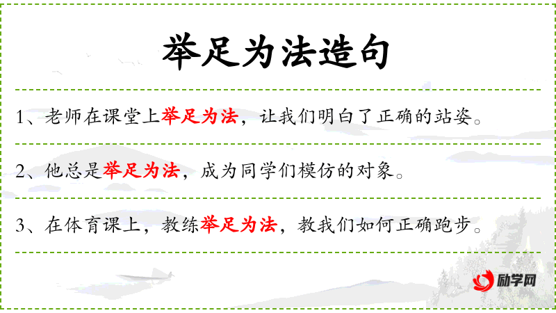 - 举足为法:比喻以身作则,通过示范来教导。
