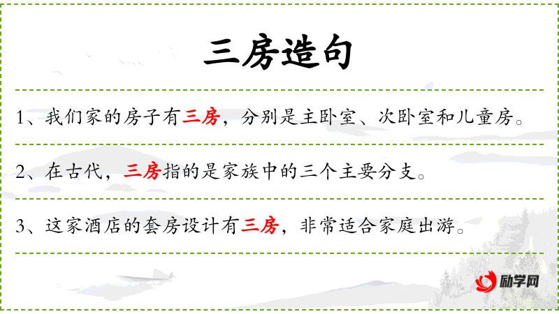 指明堂﹑明房﹑丹田之房; 指同宗族分衍出来的三个支派; 三房妻室。