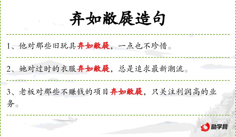 - 弃如敝屣:比喻对某物极其轻视,不屑一顾。