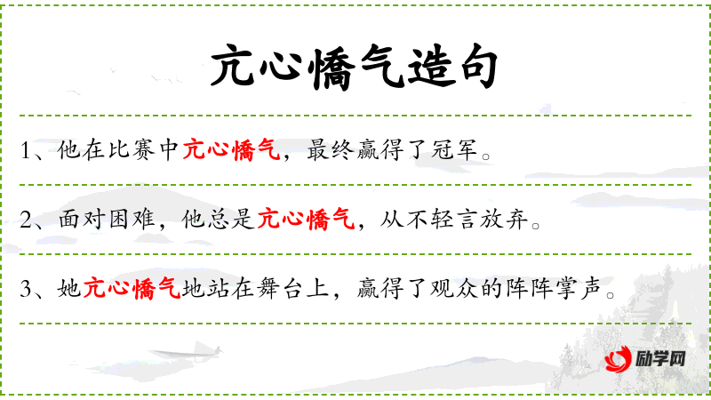 - 亢心侐气:这个词组可能是形容词,用来形容主语的情绪状态,意指情绪高昂、自信满满。
