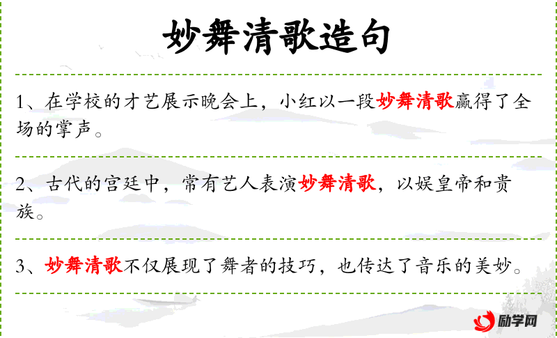 1. 【妙舞清歌】 美妙的舞蹈,清越的歌声。