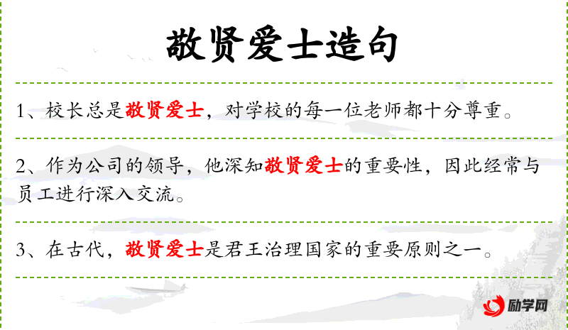 - 敬贤爱士:成语,意为尊敬贤能,爱护有才能的人。
