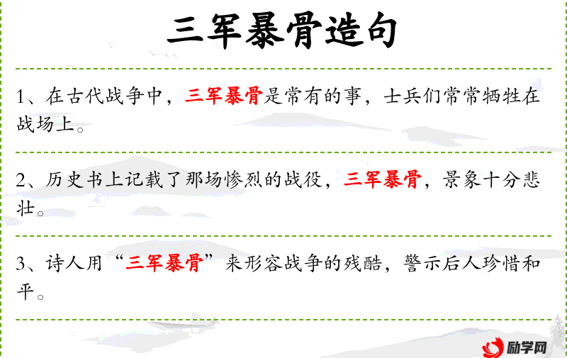 1. 【三军暴骨】 三军:指所有军队;暴:晒。三军的尸骨暴露于战场。形容战败,使军士尸横战场。