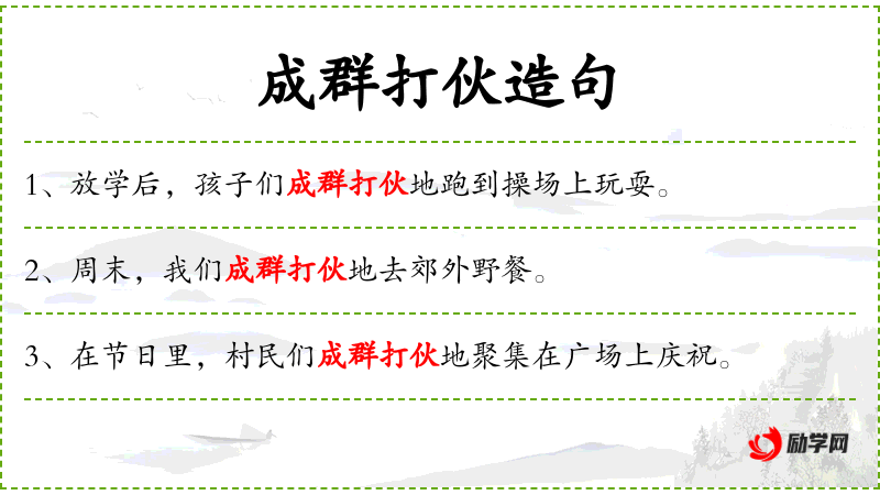 1. 【成群打伙】 指众多的人或动物聚结成一群群、一伙伙。