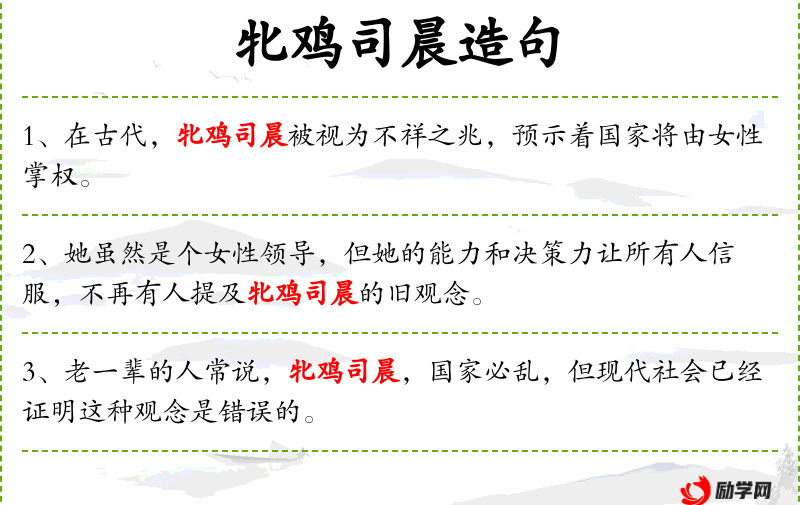 4. 【牝鸡司晨】 - 母鸡报晓。旧时比喻妇女窃权乱政。