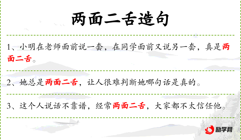 “两面二舌”是一个汉语成语,源自传统文化,用来形容人说话不真诚,有双重标准。这个成语反映了人对于言行一致的重视。