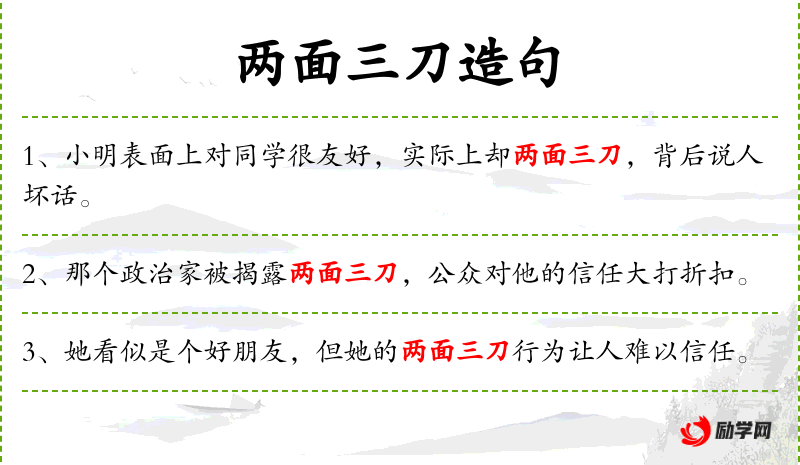 “两面三刀”是一个成语,源自古代兵器,比喻人的行为阴险狡诈。这个成语在文化中常用来形容那些表面和善,实则心怀叵测的人。