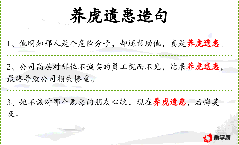 - 养虎遗患:成语,比喻纵容坏人,给自己留下后患。