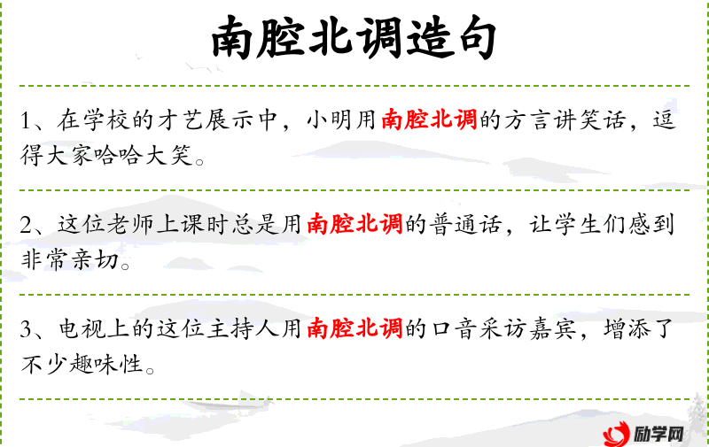 1. 【南腔北调】 原指戏曲的南北腔调。现形容说话口音不纯,搀杂着方言。